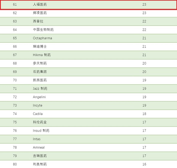 根据医药咨询公司 Novasecta 的一份全球制药公司 100 强榜单,人福医药集团荣膺全球制药公司100强第61位,该榜单按照制药企业2018年集团总收入(包括制药业务外收入)进行排名。
