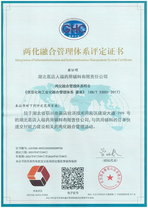 近日,葛店人福药辅取得“两化融合管理体系评定证书”,标志着公司工业化与信息化融合迈上新台阶。