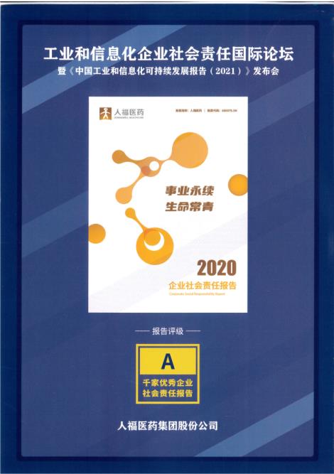 11月7日,在第四届中国国际进口博览会工业和信息化企业社会责任国际论坛上,由工业和信息化部、联合国全球契约组织主办的“2021工信千家优秀企业社会责任报告”集中发布,《人福医药集团股份公司2020企业社会责任报告》获评千家优秀企业社会责任报告信用评级A级,集团《推动物流管理智能化疏通医药仓储物流“生命线”》《依托工业互联网打通企业全供应链管理》和《积极援助海外抗疫一线》入选中国工业和信息化可持续发展案例。